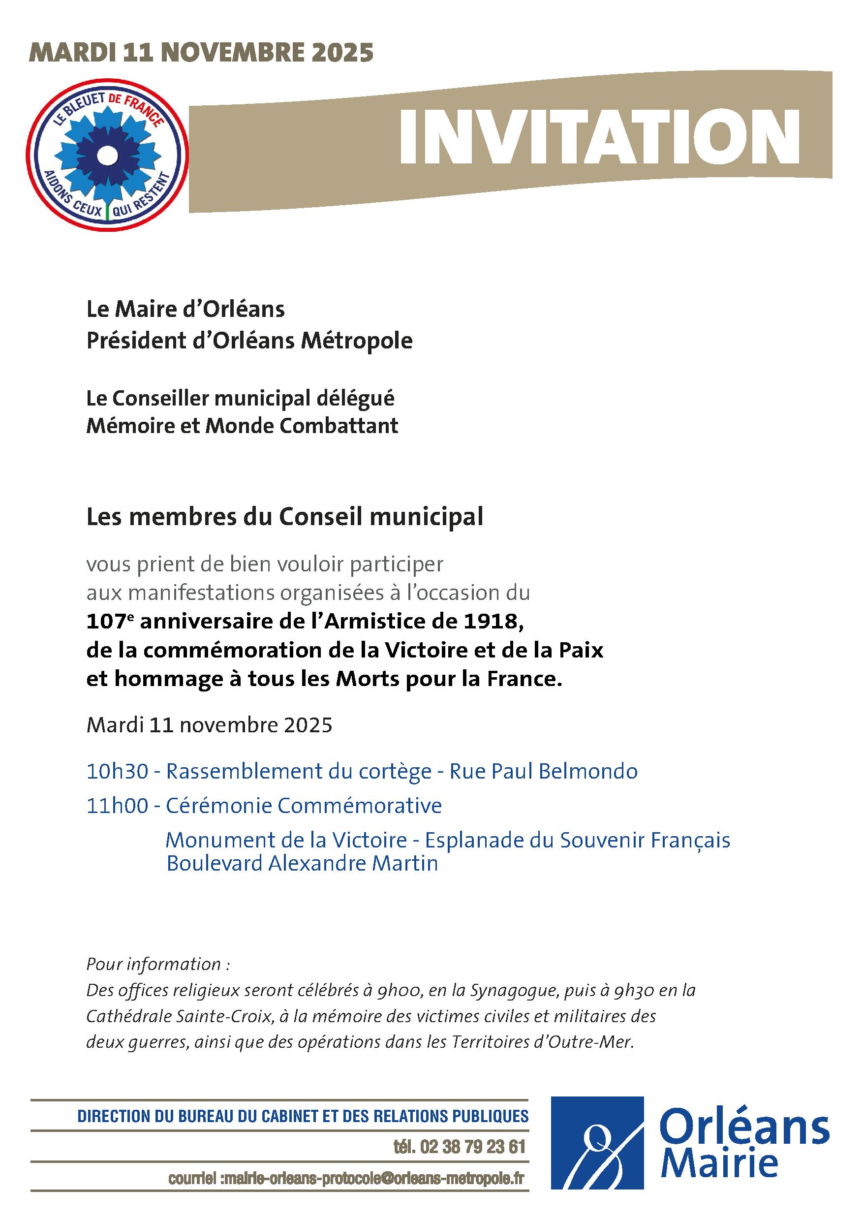 La cérémonie commémorant le 107ème anniversaire de l'Armistice de 1918 se déroulera le mardi 11 novembre 2025, à 11h00, Esplanade du Souvenir français.